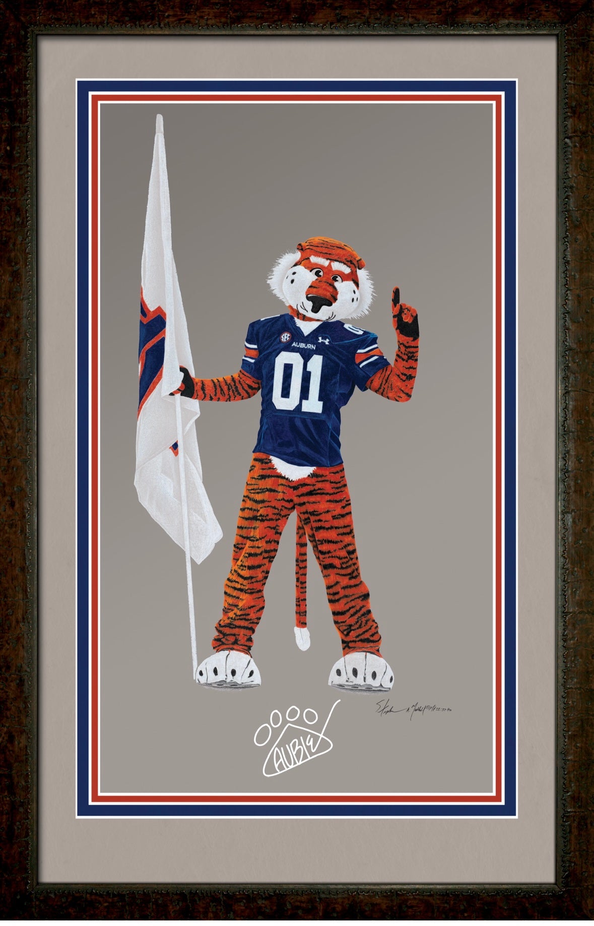 Nationally known Artist Stephen A. Malkoff is featured in Southern Living, Country Living, and Guidepost. Stephen studied architecture and was a walk-on linebacker for Auburn University under legendary Coach Pat Dye.Now Stephen is proud to introduce Aubie. Win or lose, he always makes us smile. We love Aubie! The perfect gift for the true fan. This exquisite work of art is limited to 3000 giclées. Signed and numbered by the artist, each collectible print comes with a certificate of authenticity and are on 100% acid-free archival paper. Museum-quality custom framing is also available. Your satisfaction is guaranteed.SizeUnframed: 16.5 x 27Framed: 31 x 20.5Reserve your print today. War Eagle!