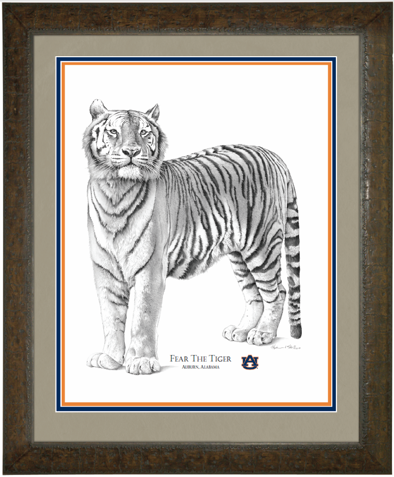 For Tiger - War Eagle, artist Stephen Malkoff designed the carved tree bark wooden frame and the triple matting in traditional school colors to complement this print.