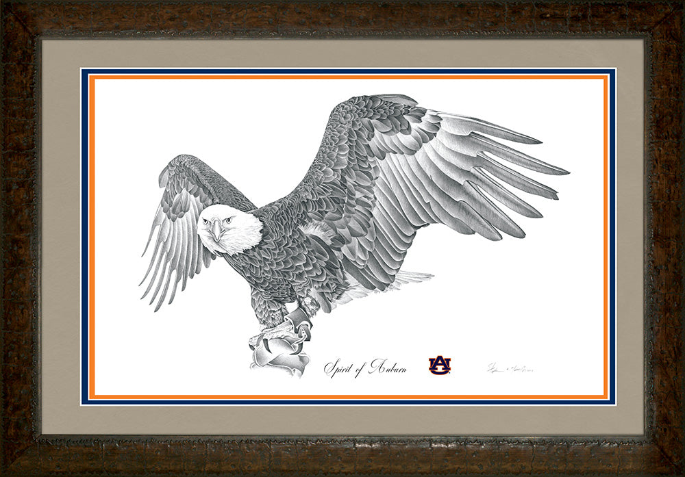 Now, Stephen is proud to team up with Auburn’s College of Veterinary Medicine and the Southeastern Raptor Center by creating a commemorative limited edition print, Spirit of Auburn. Spirit made her first flight September 28, 2002 vs. Syracuse. She is twenty-two years old and has wowed the crowd with forty gameday flights. When the eagle takes flight, it is more than a game day ritual, it is a symbol of our nation’s freedom.