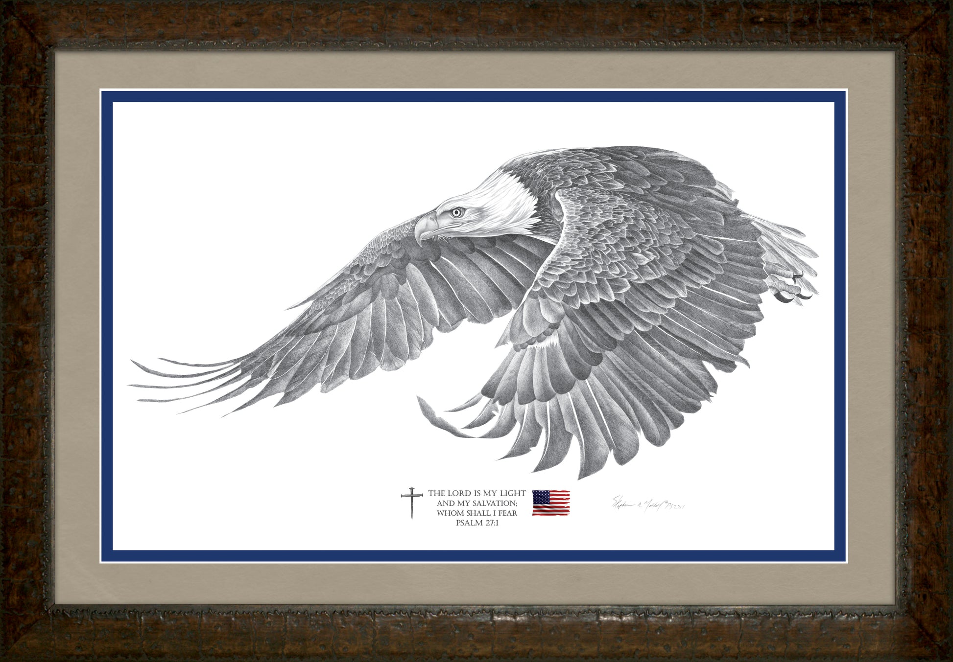 The Lord is my light and my salvation: whom shall I fear? The opening line of Psalm 27 expresses unwavering faith and trust in God as our source of both guidance and protection. Now Artist Stephen malkoff is proud to present the fearless flight of the Eagle. Standing on God’s perfect word is the only way to conquer fear and to live free.